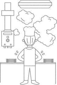 テナントや地下街等の業務用厨房では排気筒の施工が非常に困難なため、やむを得ず厨房排気フードに排出するケースが多いといわれています。そこでCOセンサーの搭載や排気温度を65℃以下に制御するなど防火性能に適応したシステムにする事で安全に排気を行います。