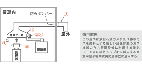 ※厨房設備に附属する排気フード内に排気トップ部を挿入する瞬間湯沸器の防火性能評定試験基準に適合すること。
