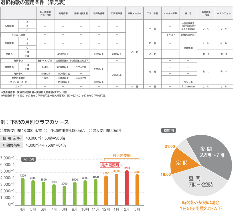 一般的なガス使用パターンには、昼と夜、夏と冬で大きな使用量の格差があります。山口合同ガスでは使用量のピークに合わせて製造・供給施設を整備して安定供給に努めています。お客さまがオフピークにもガスをお使い頂くことができれば、製造・供給施設が効率的に利用され、結果的に単位(m3)当たりの平均コストに好影響を与えることになります。このように、年間を通じて効率的なガスご使用を頂けるお客さまに、業務用料金メニューをご用意しています。
