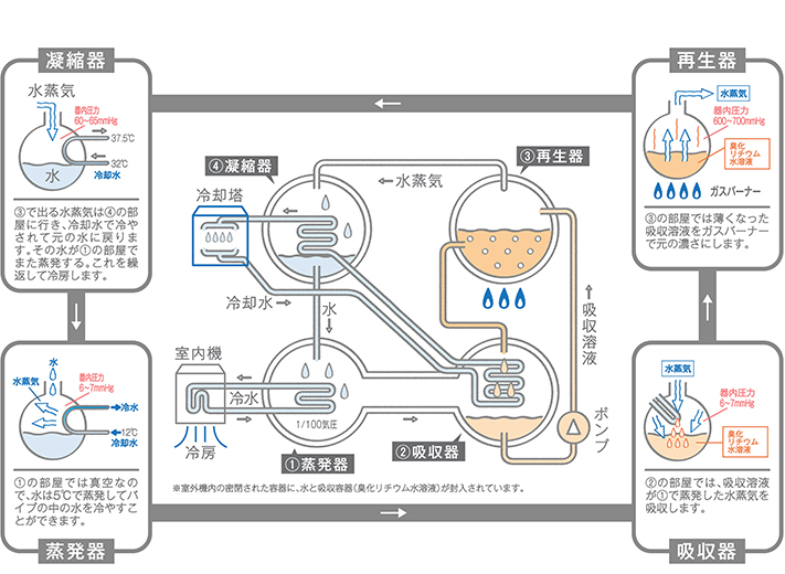 水の蒸発・吸収・再生・凝縮を繰り返します。冷媒に水、吸収溶液には臭化リチウム水溶液を使用し、フロンを全く使用していないので、環境にやさしい冷房システムです。吸収溶液の凝縮、再生に都市ガスの熱を利用します。