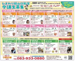 料理教室・カルチャー教室(山口)の募集を開始しました。2026.02.12Topics 料理教室・カルチャー教室(山口)の募集を開始しました。 料理教室のお申し込みはこちらから。 カルチャー教室のお申し込みはこちらから。 前の記事 記事一覧 次の記事